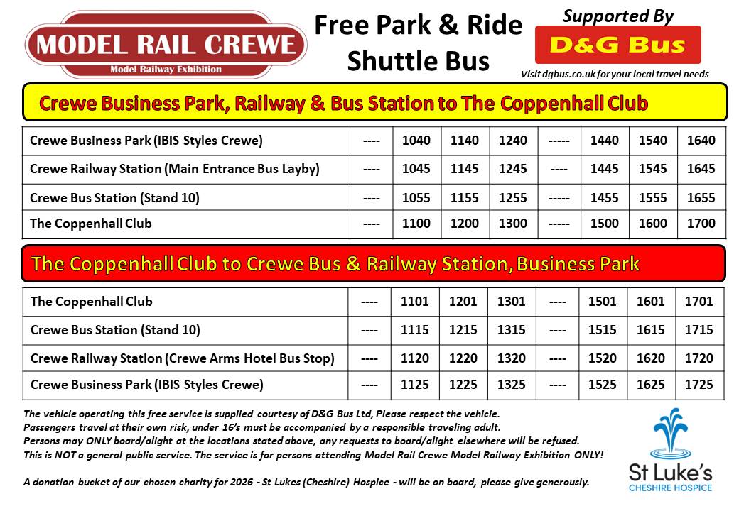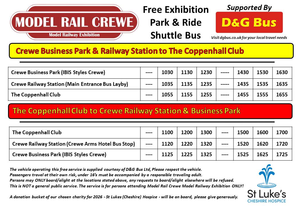 We are pleased to announce for our 2026 exhibition, D&G Bus are onboard to support Model Rail Crewe supplying the FREE Shuttle Bus with Park & Ride.